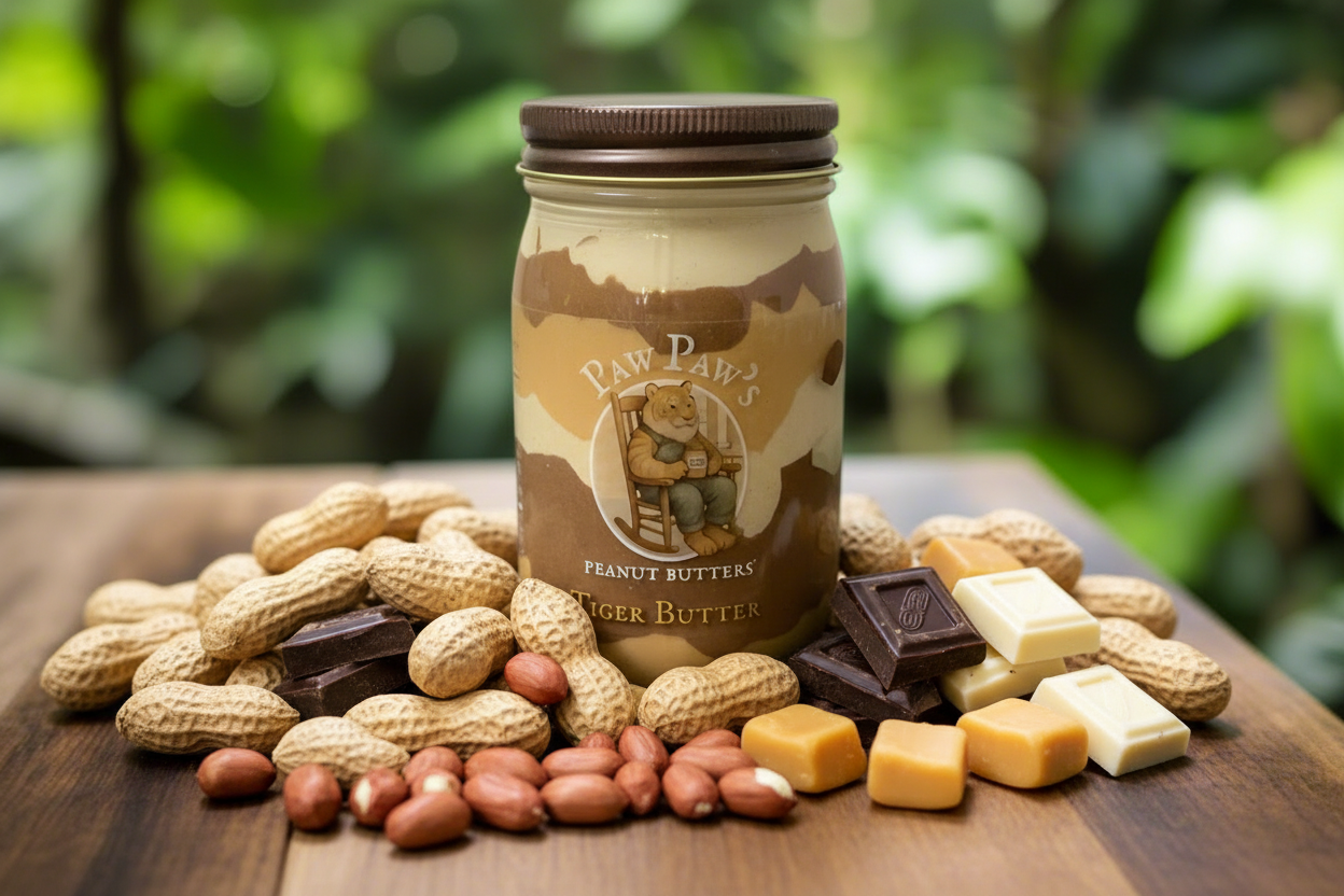 Paw Paw’s Tiger Butter is a rich, creamy blend of peanut butter and chocolate, swirled together to create a smooth, dessert-like treat made for sharing.Pawpaw's Peanut Butter